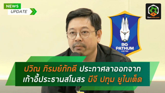 วงการฟุตบอลไทยต้องสั่นสะเทือนอีกครั้ง เมื่อสโมสร บีจี ปทุม ยูไนเต็ด ออกแถลงการณ์ยืนยันว่า “คุณปวิณ ภิรมย์ภักดี” ได้ตัดสินใจลาออกจากตำแหน่งประธานสโมสรอย่างเป็นทางการ โดยมีผลทันที เหตุผลหลักมาจากเรื่องสุขภาพและเหตุผลส่วนตัว ซึ่งนับเป็นการเปลี่ยนแปลงครั้งสำคัญของทัพ “เดอะ แรบบิท” ที่กำลังสร้างชื่อในเวทีลูกหนังไทยและเอเชีย