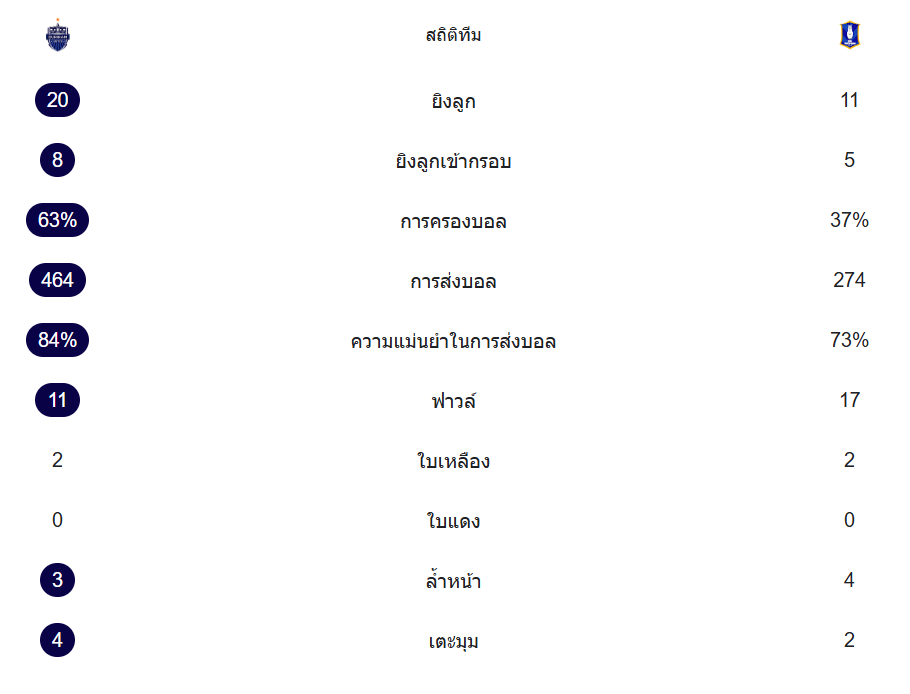 บุรีรัมย์ครองบอลถึง 63% สร้างโอกาสยิงมากถึง 20 ครั้ง เข้ากรอบ 8 ครั้ง ขณะที่บีจี ปทุม ยิง 11 ครั้ง เข้ากรอบ 5 ครั้ง เกมรับของบีจีแม้จะถูกบุกใส่อย่างหนัก แต่ยังต้านทานไว้ได้ ส่วนการผ่านบอล บุรีรัมย์ทำได้ 464 ครั้งแม่นยำ 84% เทียบกับบีจีที่ผ่าน 274 ครั้งแม่นยำ 73% แสดงให้เห็นชัดว่าบุรีรัมย์คุมเกม แต่บีจีอันตรายทุกครั้งที่มีโอกาส