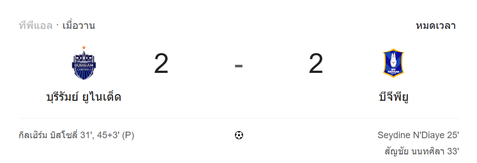 จาก : ผลบอลสด ไทยลีก ระหว่าง บุรีรัมย์ ยูไนเต็ด 2-2 บีจี ปทุม ยูไนเต็ด วันนี้ 5/10/68 – บ้านกีฬา