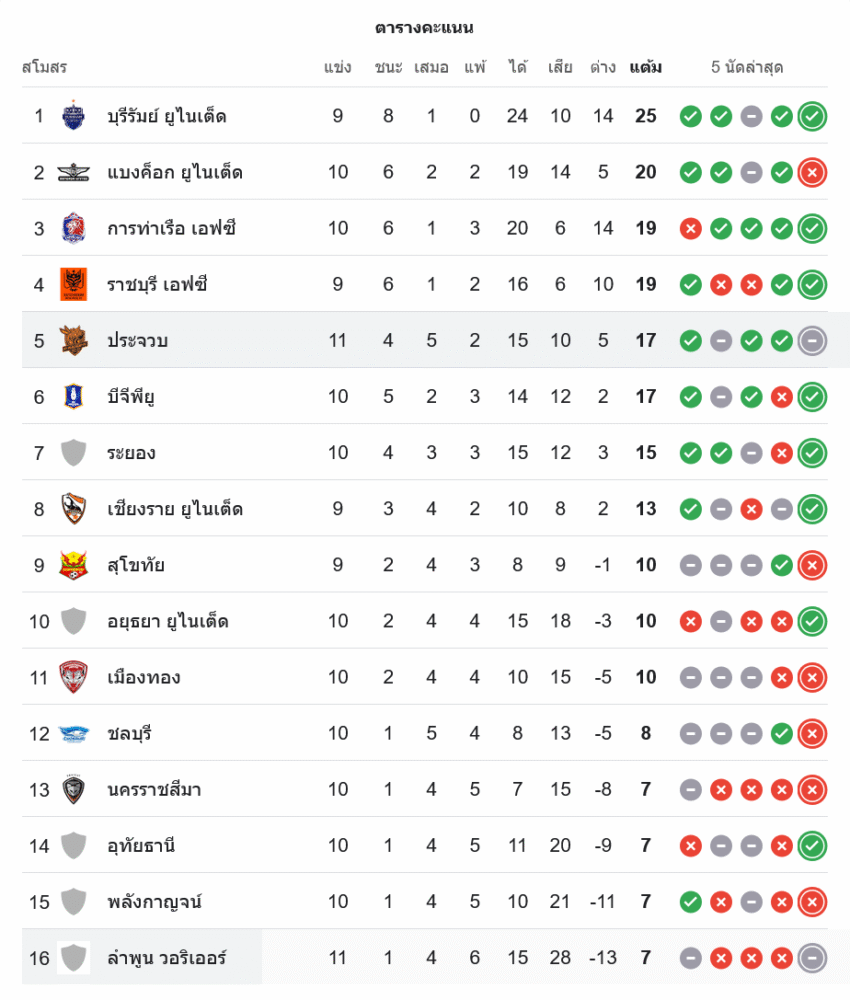 ส่วน ลำพูน วอร์ริเออร์ สถานการณ์ยังน่าเป็นห่วงหนัก ลงเล่น 11 นัด ชนะเพียง 1 เสมอ 4 แพ้ถึง 6 ได้ 15 เสีย 28 ลูกได้เสีย -13 มีแค่ 7 คะแนน รั้งบ๊วยอันดับ 16 ต่อไป ฟอร์มในภาพรวม 5 นัดหลังสุดเต็มไปด้วยสัญลักษณ์สีแดงในช่อง บ้านผลบอล สะท้อนชัดว่าทีมต้องรีบหาทางเก็บชัยชนะให้ได้โดยด่วนหากไม่อยากตกชั้น