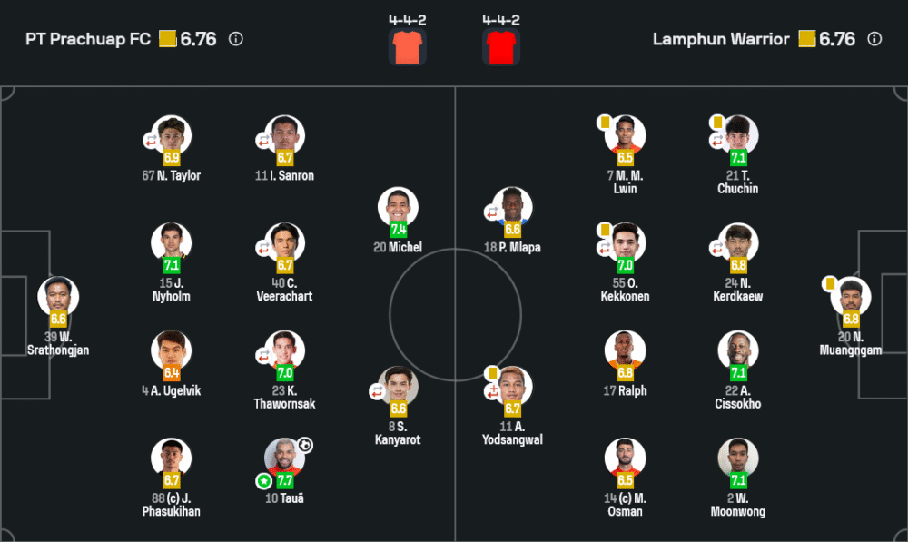 หากมองในมุม วิเคราะห์บอล แท็กติก เกมนี้ประจวบเหนือกว่าชัดในแง่ “คอนโทรลบอล” ระบบ 4-4-2 ของเจ้าถิ่นเน้นดันแบ็กสองข้างสูง จนเฉลี่ยตำแหน่งการเล่น (average positions) เห็นชัดว่าแบ็กและปีกยืนเกือบคร่อมเส้นกลางสนาม ทั้ง นิว เทเลอร์, ผาสุขขันธ์, มิเชล, ฮอนนี่ ทำให้คู่มิดฟิลด์ลำพูนต้องไล่ประกบสองทางตลอดเวลา