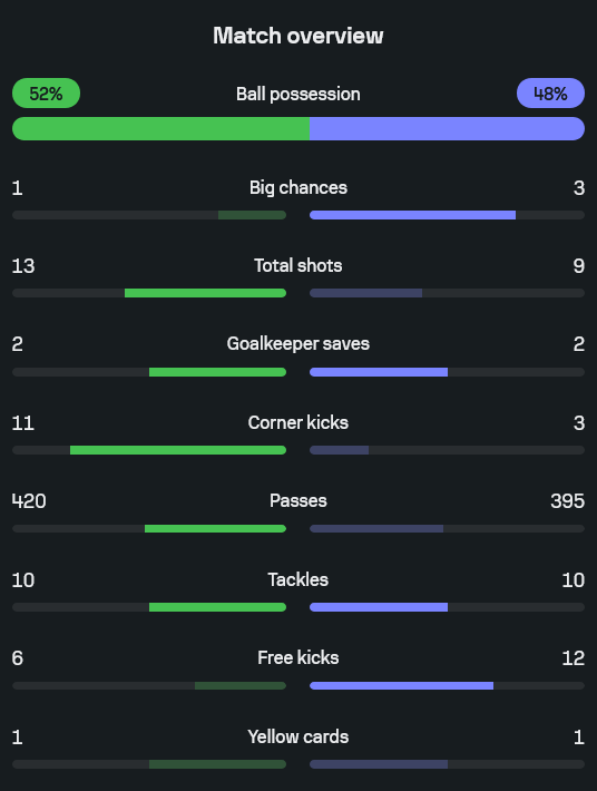 เกมนี้มีความสูสีสูง ไทยครองบอลมากกว่าเล็กน้อย 52% ต่อ 48% และยิงรวม 13 ครั้ง มากกว่าสิงคโปร์ที่ยิง 9 ครั้ง ไทยมีเตะมุมถึง 11 ครั้ง ขณะที่สิงคโปร์มีเพียง 3 ทำให้เห็นชัดว่าทัพช้างศึกกดเกมอยู่ฝั่งตรงข้ามได้บ่อย แต่สิงคโปร์มี “ประสิทธิภาพ” ในการยิงค่อนข้างสูงจากจำนวนครั้งที่น้อยกว่า ไทยผ่านบอล 420 ครั้งเหนือกว่าสิงคโปร์ที่ 395 เล็กน้อย เกมนี้มีความเร็วสูงเพราะทั้งสองทีมแท็คเกิลรวมกันถึง 20 ครั้ง และได้ฟาวล์รวมเยอะพอสมควร