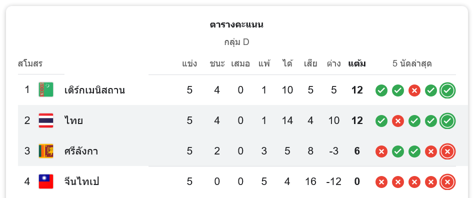 หลังชนะศรีลังกา 4-0 ไทยเก็บเพิ่มเป็น 12 แต้ม เท่ากับเติร์กเมนิสถาน แต่ประตูได้เสียไทยดีกว่า ทำให้ขึ้นนำจ่าฝูงทันที ขณะที่ศรีลังกาคงอยู่ที่ 3 มี 6 แต้ม และจีนไทเปยังคงไร้แต้ม