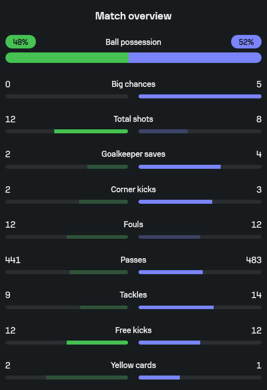 แม้ตัวเลขการครองบอลจะใกล้กัน เมืองทองถือบอล 48% ต่อ 52% ของบุรีรัมย์ แต่คุณภาพการโจมตีต่างกันอย่างชัดเจน เมืองทองยิงทั้งหมด 12 ครั้ง ทว่ากลายเป็นโอกาสจะแจ้งจริงๆ แทบไม่มี ในขณะที่บุรีรัมย์ยิงเพียง 8 ครั้งแต่เป็น “บิ๊กแชนซ์” ถึง 5 ลูก และเปลี่ยนเป็นประตูถึง 5 ลูกเต็มๆ