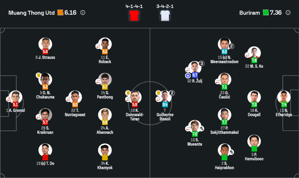 • ศุภณัฏฐ์ เหมือนตา (7.0) ด้านซ้าย วิ่งไม่หมด แอสซิสต์ให้บิสโซลีได้แบบเนียนๆ