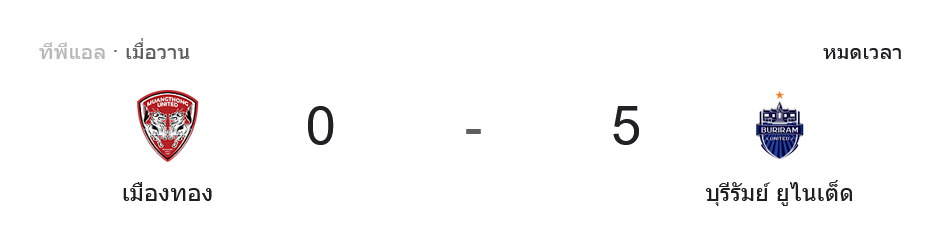 ศึก ไทยลีก 1 นัดใหญ่ที่สนามเหย้าเมืองทอง ยูไนเต็ด กลายเป็นค่ำคืนสุดฝันของแฟนบุรีรัมย์ และฝันร้ายของกิเลนผยอง เมื่อสกอร์บนหน้าจอ ผลบอลสด จบลงที่ เมืองทอง ยูไนเต็ด แพ้คาบ้านให้ บุรีรัมย์ ยูไนเต็ด แบบขาดลอย 0-5 บ้านกีฬาเห็นภาพชัดว่าเกมนี้ทีมเยือนคุมทุกจังหวะ ทั้งความเฉียบคม หนักแน่น และมีวินัย จนเจ้าถิ่นแทบไม่มีจุดให้หายใจ