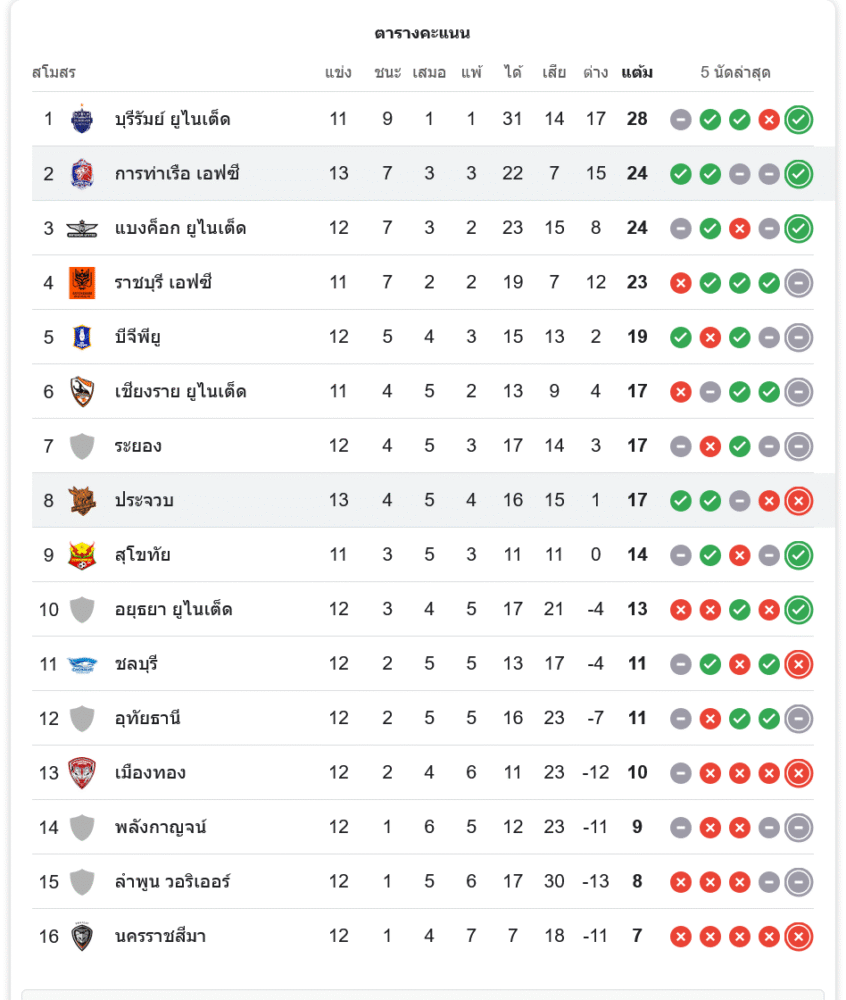 ด้านประจวบลงเล่นครบ 13 นัดยังหยุดอยู่ที่ 17 คะแนน รั้งอันดับ 8 กึ่งกลางตาราง แม้ไกลจากโซนตกชั้น แต่หากสะดุดต่อเนื่องก็มีโอกาสถูกทีมกลุ่มล่างไล่จี้ได้เหมือนกัน เกมต่อ ๆ ไปจึงสำคัญต่อการรักษาระยะห่างในโซนปลอดภัยอย่างยิ่ง