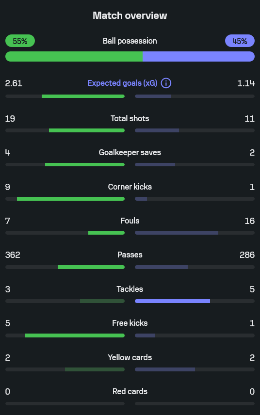 เมื่อดูตัวเลขสถิติหลังเกม ศรีสะเกษ ยูไนเต็ดครองบอลราว 55% เหนือกว่าโปลิศ เทโรที่มี 45% แต่ที่เห็นชัดคือจำนวนโอกาสยิง เจ้าบ้านซัดไปถึง 19 ครั้ง มากกว่าทีมเยือนที่มีเพียง 11 ครั้ง ค่า xG ของศรีสะเกษโดดไปแถว 2.61 ขณะที่เทโรอยู่แถว 1.14 บ่งบอกว่าคุณภาพโอกาสของเจ้าถิ่นสูงกว่า
