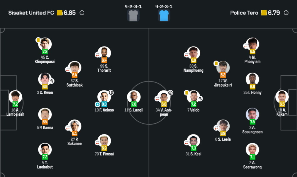 - ธัชพล ไชยยันต์ (6.7) ลง น.63 แทน ศุภพล สุทธิศักดิ์ เติมมิติการจ่ายบอล