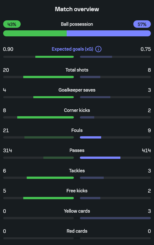ยอดการจ่ายบอล ราษีไศลเหนือกว่าที่ 414 ครั้ง ขณะที่แพร่จ่ายไป 314 ครั้ง แต่ความแม่นยำในแดนท้ายของทีมเยือนทำได้เฉียบกว่า จนไม่เสียประตูเลยทั้งแมตช์ แม้จะต้องรับแรงกดดันจากการบุกของเจ้าบ้านต่อเนื่องตลอด 90 นาที