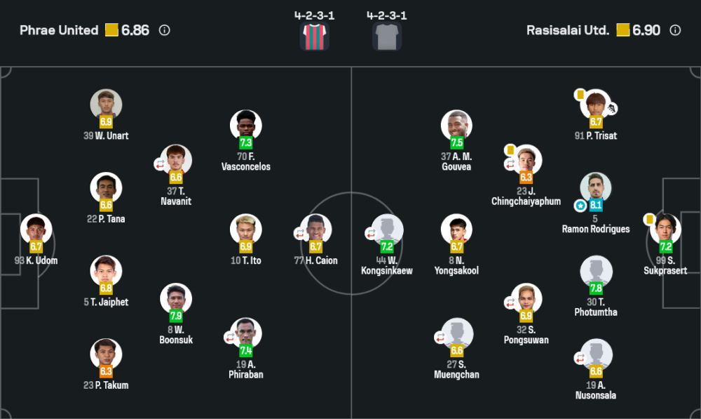 - 🔁 นาที 61 – ราษีไศล ยูไนเต็ด เปลี่ยนสองคนรวด ชิลเบร์ตู มาเชนา ลงแทน จิราวัฒน์ ชิงชัยภูมิ และ นัฐพล ยงสกุล ลงแทน สหรัฐ เมืองจันทร์ เพื่อเพิ่มพลังริมเส้นและกลางสนาม