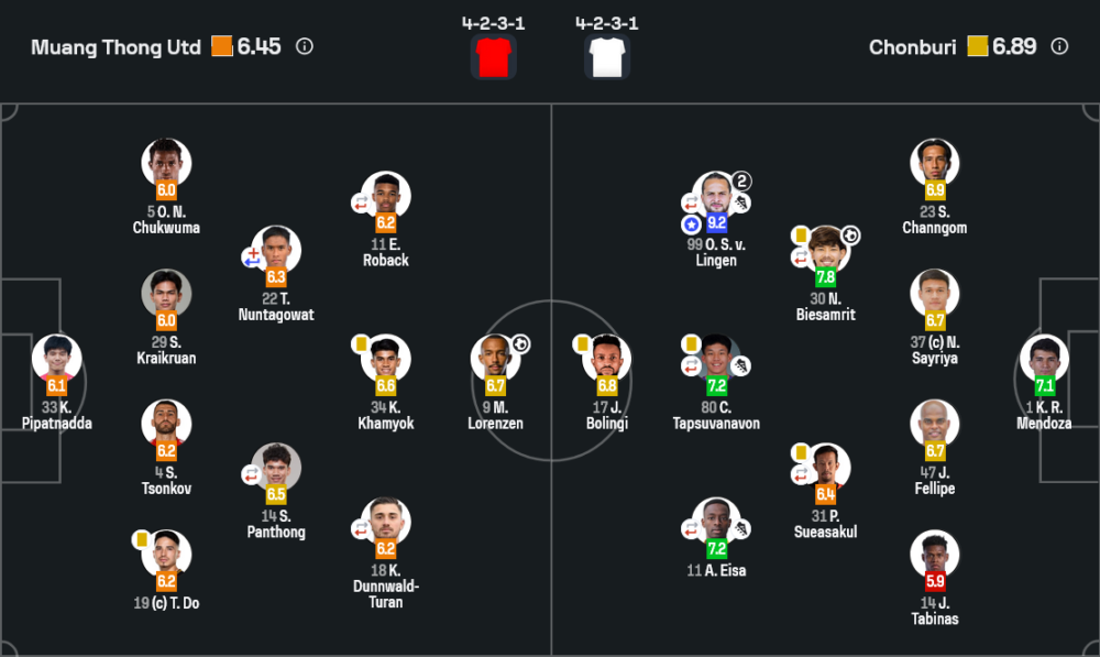 - เนลสัน ออร์จิ – 6.0 ดวล 1 ต่อ 1 กับตัวรุกชลบุรีหนักตลอดเกม มีทั้งชนะและแพ้ปะปนกันไป