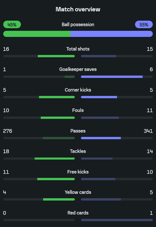 เมื่อมองจากตัวเลขหลังเกม ชลบุรีครองบอลได้ 45% ส่วนพลังกาญจน์ถือบอลมากกว่าเล็กน้อยที่ 55% แต่จำนวนโอกาสยิงกลับใกล้เคียงกัน เจ้าถิ่นกดไป 16 ครั้ง ส่วนทีมเยือนยิง 15 ครั้ง แสดงให้เห็นว่าเกมเปิดหน้าแลกกันตลอด