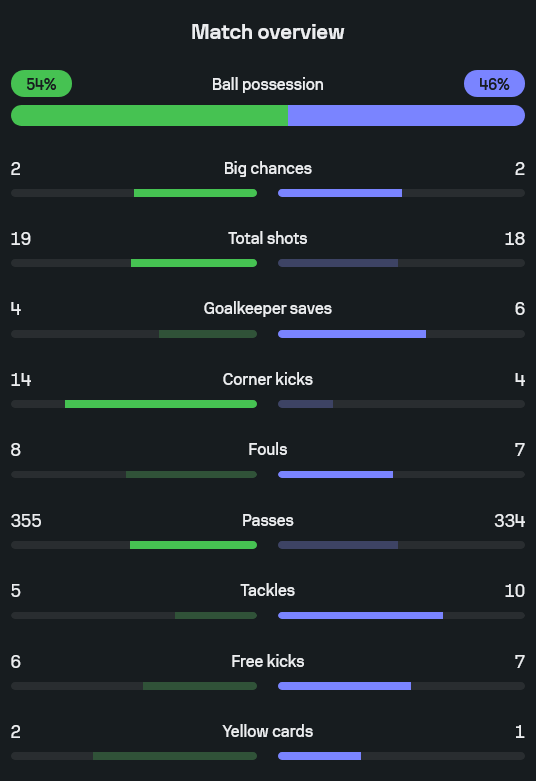 ถึงแม้ตัวเลขการครองบอลจะเทไปทางระยอง 54% ต่อ 46% แต่ความจริงบนสนามกลับสะท้อนว่า ราชบุรียืนคุมโซนแล้วรอจังหวะเล่นงานคู่แข่งอย่างเยือกเย็น ทั้งสองทีมสร้างโอกาสเหน่งๆ เท่ากันที่ 2 ครั้ง และมีจำนวนครั้งยิงใกล้เคียงกัน ระยองยิงทั้งหมด 19 ครั้ง ส่วนราชบุรียิง 18 ครั้ง แต่ทีมเยือนเปลี่ยนเป็น 4 ประตู ขณะที่เจ้าถิ่นเปลี่ยนได้เพียง 2