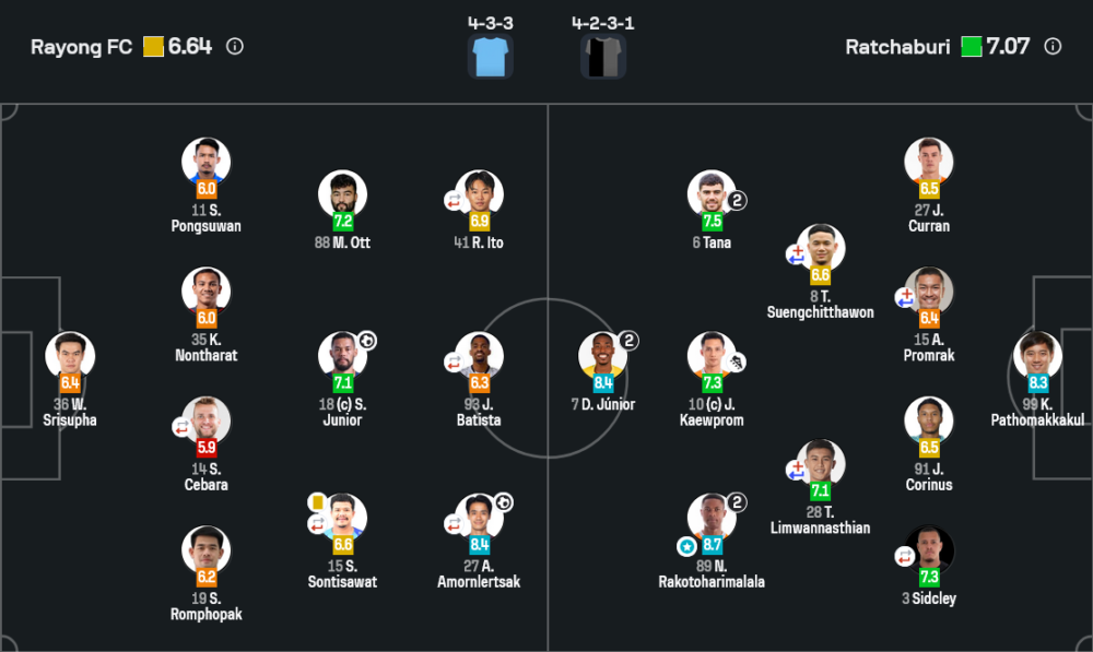 แม้ เดนิลสัน จะยิงสองลูก แต่รางวัลผู้เล่นยอดเยี่ยมประจำเกมนี้ต้องยกให้ เอ็นจีวา ราโคโตฮาริมาลาลา แบบไร้ข้อโต้แย้ง คะแนน 8.7 จาก Sofascore สะท้อนทุกอย่างชัดเจน เขาเป็นตัวป่วนแนวรับระยองตลอด 90 นาที ใช้สปีดและการเลี้ยงกินตัวทำลายโครงสร้างเกมรับเจ้าบ้านหลายครั้ง ลูกแรกของทีมก็มาจากการลากเข้าเขตโทษจนได้จุดโทษ ก่อนที่ครึ่งหลังจะกดเองสองเม็ด ทั้งการสอดเข้ายิงจากเสาไกลและการหาจังหวะจบสกอร์ในกรอบเขตโทษ