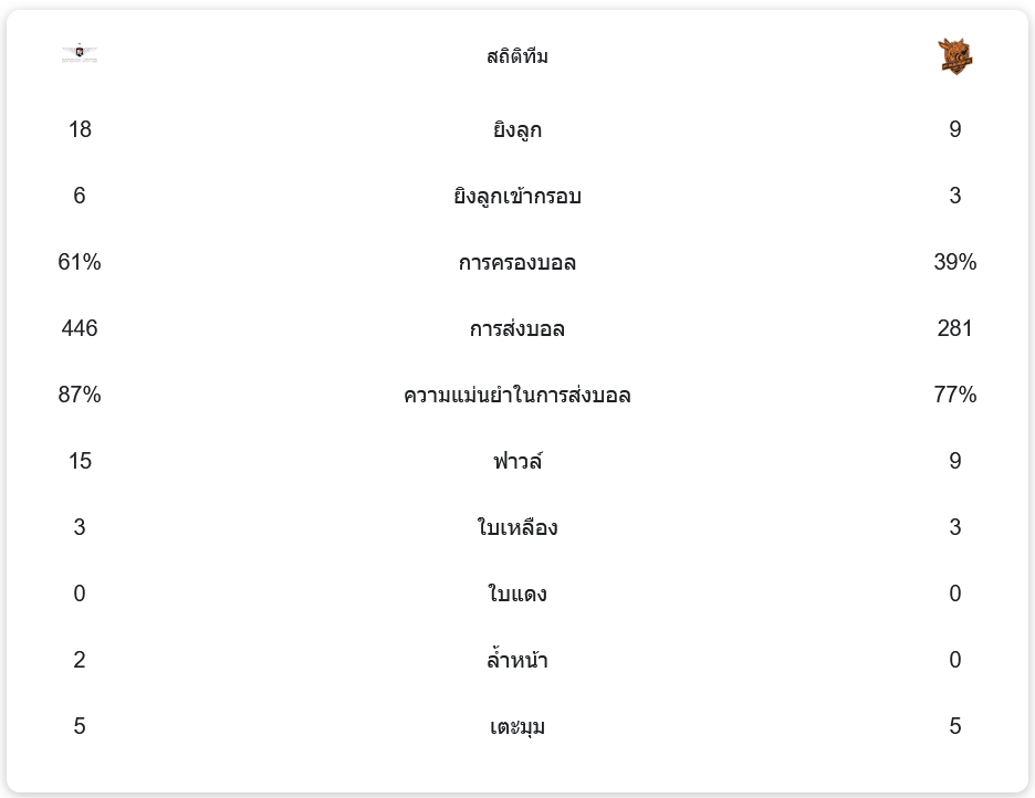 - ทรู แบงค็อก ยูไนเต็ด ยิงทั้งหมด 18 ครั้ง โดยเข้ากรอบ 6 ครั้ง ครองบอล 61% ส่งบอลได้ 446 ครั้ง ด้วยความแม่นยำในการส่งบอล 87% ทำฟาวล์ 15 ครั้ง ได้รับใบเหลือง 3 ใบ ล้ำหน้า 2 ครั้ง และเตะมุม 5 ครั้ง