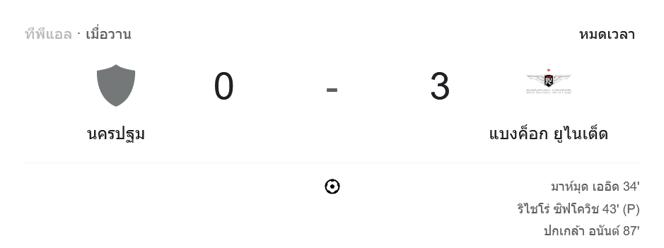 ทรู แบงค็อก ยูไนเต็ด ทำผลงานได้อย่างยอดเยี่ยมในศึกไทยลีก 2024 เมื่อเอาชนะ นครปฐม เอฟซี 3-0 ที่สนามนครปฐมเมื่อคืนนี้ โดยประตูของทรู แบงค็อก ยูไนเต็ด มาจากการยิงของ มาห์มูด เอลอิบ ในนาทีที่ 34, ร็อบโต้ ชาฟโควิช ยิงจุดโทษในนาทีที่ 43 และ ปลกกล้า อนันต์ ปิดท้ายในนาทีที่ 87