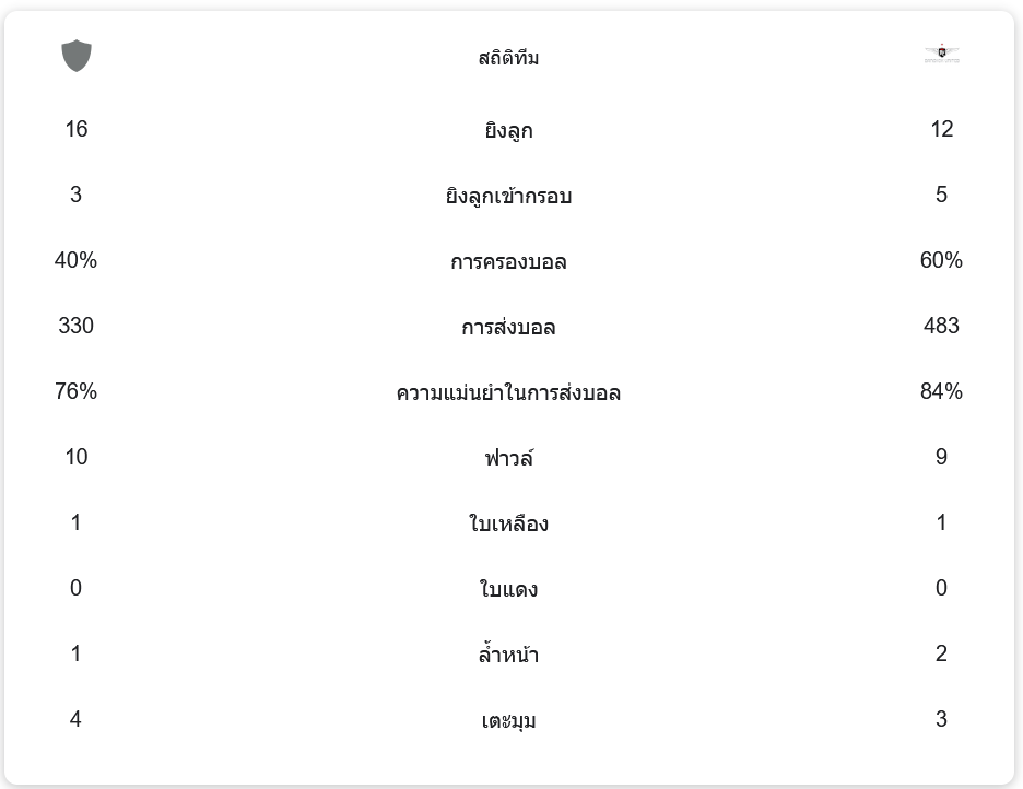 ในการแข่งขันนี้ ทรู แบงค็อก ยูไนเต็ด ครองบอลมากกว่า โดยมีอัตราการครองบอลถึง 60% เทียบกับนครปฐมที่ครองบอล 40% แบงค็อกมีโอกาสยิงทั้งหมด 12 ครั้ง ยิงเข้ากรอบ 5 ครั้ง ในขณะที่นครปฐมมีโอกาสยิง 16 ครั้ง ยิงเข้ากรอบ 3 ครั้ง ความแม่นยำในการส่งบอลของแบงค็อกอยู่ที่ 84% จากการส่งบอลทั้งหมด 483 ครั้ง ส่วนของนครปฐมอยู่ที่ 76% จากการส่งบอล 330 ครั้ง การทำฟาวล์เกิดขึ้นบ่อยครั้งในเกมนี้ โดยนครปฐมทำฟาวล์ 10 ครั้ง ได้รับใบเหลือง 1 ใบ ขณะที่ทรู แบงค็อกทำฟาวล์ 9 ครั้ง และได้รับใบเหลือง 1 ใบ