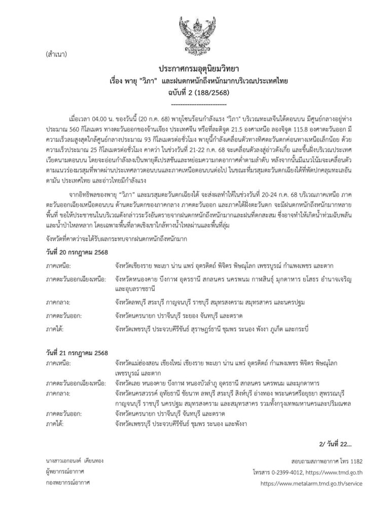 พายุ “วิภา” เป็นพายุโซนร้อนกำลังแรงที่แม้จะอ่อนกำลังลงเมื่อเข้าใกล้ไทย แต่ยังทิ้งผลกระทบต่อฝนตกหนักในหลายพื้นที่ทั่วประเทศ ฝนสะสมอาจก่อให้เกิดน้ำท่วมฉับพลัน น้ำป่าไหลหลากได้ทุกเวลา ขอให้ประชาชนติดตามประกาศจาก กรมอุตุนิยมวิทยา อย่างใกล้ชิดทั้งจาก www.tmd.go.th หรือสายด่วน 1182 ตลอด 24 ชั่วโมง เพื่อความปลอดภัยของทุกคน