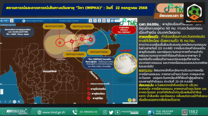 เช้านี้อากาศเหนือฟ้าประเทศไทยปกคลุมด้วยมวลเมฆหนาทึบ หลายพื้นที่เริ่มได้ยินเสียงฟ้าร้องฟ้าแลบลั่นสนั่น ข้อมูลล่าสุดจาก กรมอุตุนิยมวิทยา ออกประกาศเตือนภัยรอบใหม่ ชี้ชัดวันนี้ (22 ก.ค. 68) พายุโซนร้อนกำลังแรง “วิภา” ซึ่งก่อตัวและหมุนอยู่เหนืออ่าวตังเกี๋ย เริ่มเคลื่อนตัวขึ้นฝั่งประเทศเวียดนามตอนบน ด้วยความเร็วลมใกล้ศูนย์กลางกว่า 100 กม./ชม. ส่งผลโดยตรงต่อสภาพอากาศบ้านเรา ทำให้หลายจังหวัดทั่วประเทศต้องเฝ้าระวังฝนตกหนักถึงหนักมาก น้ำท่วมฉับพลัน และน้ำป่าไหลหลากอย่างใกล้ชิด โดยเฉพาะ ภาคเหนือ ภาคอีสาน ภาคตะวันตก และตะวันออก ที่โดนจัดหนักเต็มๆ