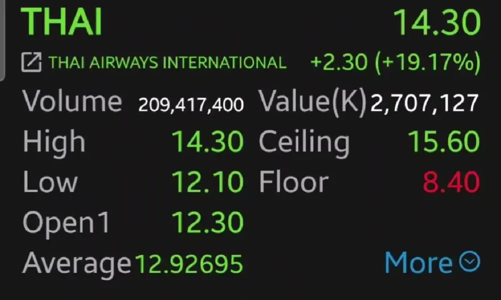 จากราคาเปิด 10.50 บาท วันที่ 4 ส.ค. หุ้น THAI ยังพุ่งไม่หยุด วันที่ 6 ส.ค. ราคาพุ่งไปถึง 19.17 บาท ก่อนย่อลงมาที่ 14.30 บาท ยังคงเพิ่มขึ้นกว่า 327% จากราคา IPO เดิม