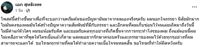ข้อความในโพสต์ของเอกเต็มไปด้วยความสำนึกผิด เขารับตรงๆ ว่า นอกใจภรรยา และความมักมากของเขาทำให้ชีวิตคู่พังพินาศ แม้เขาจะไม่เหลือ “ราคา” ให้ใครเชื่อถืออีกแล้ว แต่ยังอยากรักษาภรรยาและครอบครัวเอาไว้ “ด้วยทุกอย่างที่สามารถแลกได้”