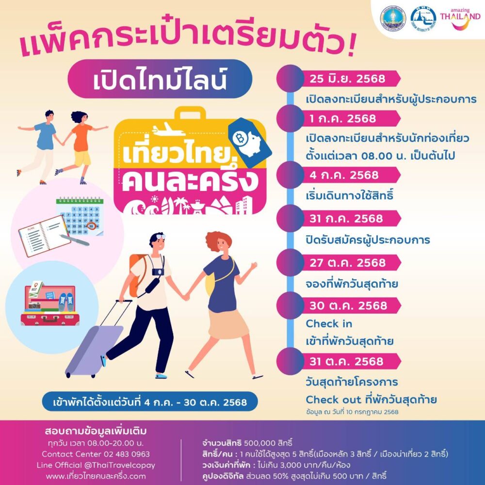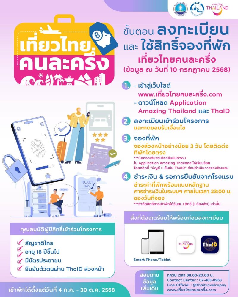 โครงการ “เที่ยวไทยคนละครึ่ง” เป็นนโยบายกระตุ้นเศรษฐกิจและการท่องเที่ยวภายในประเทศ ภายใต้วงเงิน 1,750 ล้านบาท ที่รัฐบาลสนับสนุนให้ประชาชนเที่ยวไทยแบบประหยัด โดยรัฐสมทบเงิน 50% ของค่าที่พัก สูงสุดไม่เกิน 3,000 บาทต่อคืนต่อห้อง จำกัดสูงสุด 5 สิทธิต่อคน และสามารถจองใช้สิทธิได้ตั้งแต่วันที่ 4 กรกฎาคม – 31 ตุลาคม 2568
