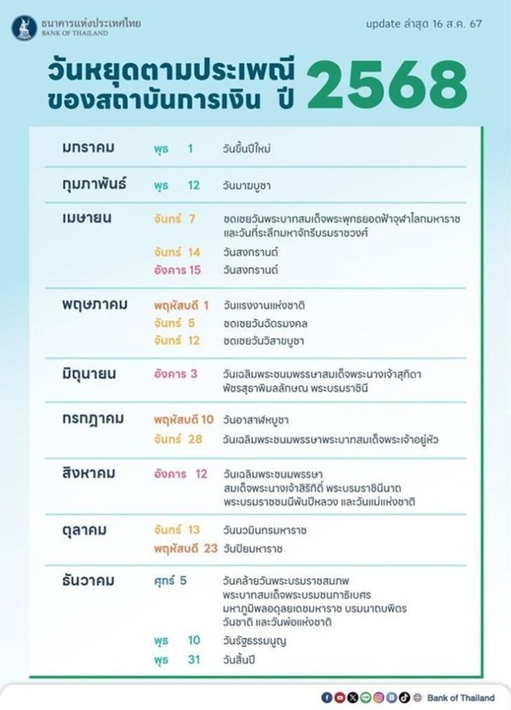 สรุปวันหยุดธนาคาร “สิงหาคม 2568”