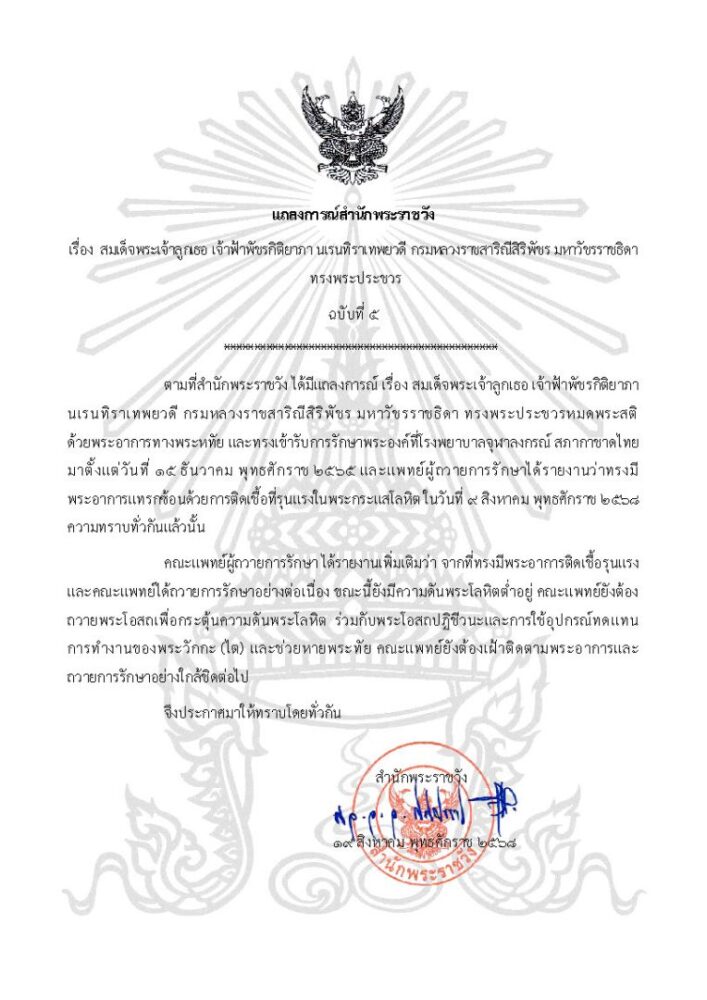 แถลงการณ์สำนักพระราชวัง ฉบับที่ 4-5 พระอาการเจ้าฟ้าพัชรกิติยาภาฯ ทรงติดเชื้อรุนแรงและความดันพระโลหิตต่ำ