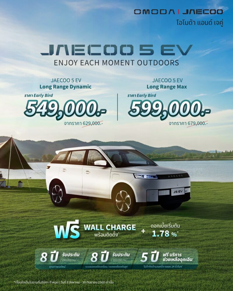 - JAECOO 5 EV Long Range Max : 599,000 บาท (ราคาพิเศษ จากปกติ 679,000 บาท)