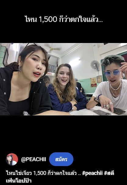 พีชชี่เล่าว่า ไปทานร้านเจ๊ไฝพร้อมรุ่นพี่และเพื่อน รวม 3 คน โดยสั่งอาหาร 4 เมนู ได้แก่ ไข่เจียวปู ราดหน้าหมู ก๋วยเตี๋ยวคั่วไก่ และข้าวผัดหมู รวมทั้งเครื่องดื่ม ซึ่งเมนูไข่เจียวปูในเล่มแจ้งราคาไว้ที่ 1,500 บาท