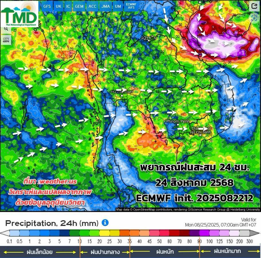 ข้อมูลจากแบบจำลองของศูนย์พยากรณ์อากาศยุโรป (ECMWF) ระบุว่า ตั้งแต่ 23 ส.ค.–2 ก.ย. 68 ประเทศไทยจะมีฝนเพิ่มขึ้นเกือบทุกพื้นที่ บางวันตกหนักมาก โดยพายุคาจิกิอาจจะอ่อนกำลังลงเป็นหย่อมความกดอากาศต่ำ แต่ยังคงสร้างอิทธิพลให้เกิดฝนหนักสะสมได้หลายจังหวัด