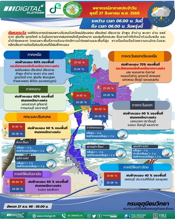 • ภาคเหนือ: ฝนฟ้าคะนอง 80% ของพื้นที่ ฝนตกหนัก-หนักมาก อุณหภูมิสูงสุด 32°C ต่ำสุด 21°C