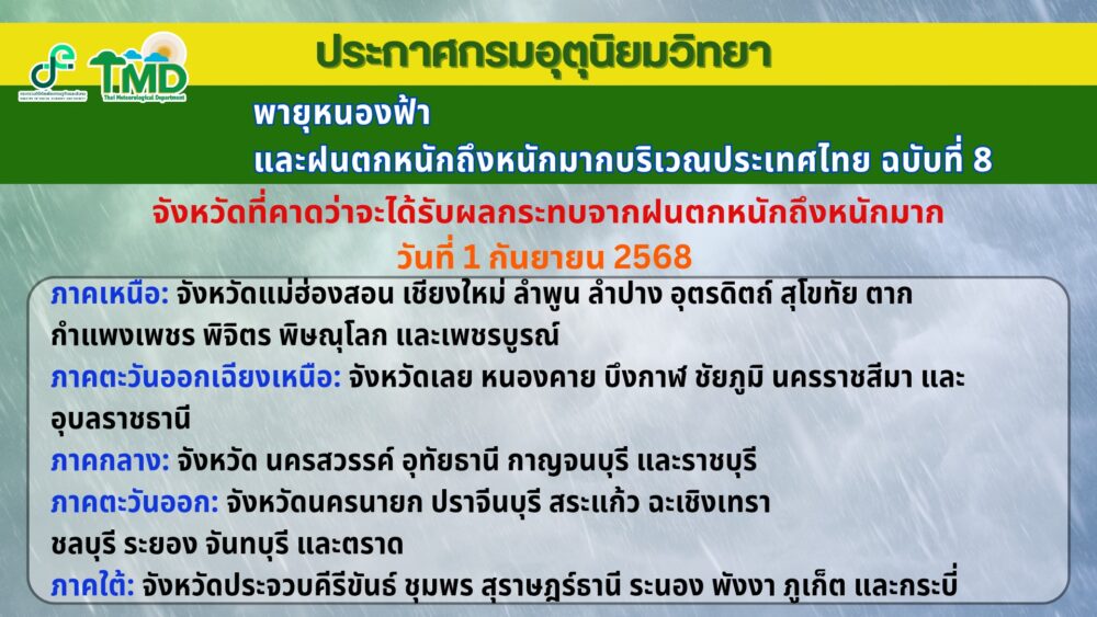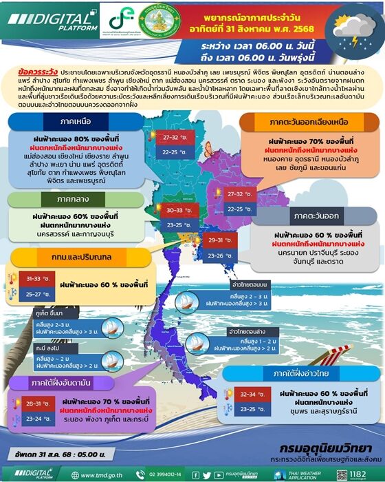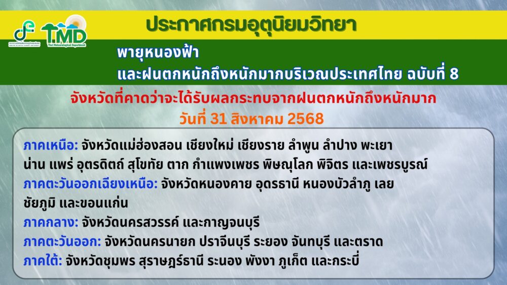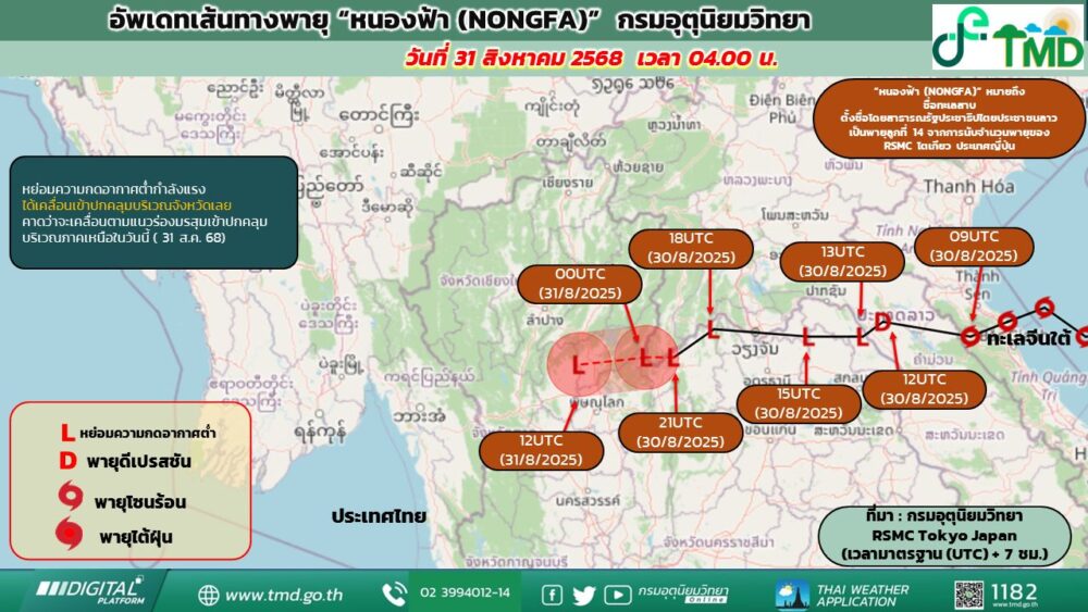 เมื่อวันที่ 31 สิงหาคม 2568 กรมอุตุฯ ระบุว่า หย่อมความกดอากาศต่ำจาก พายุดีเปรสชั่นหนองฟ้า เคลื่อนตัวตามแนวร่องมรสุม เข้าปกคลุมจังหวัดเลย และคาดว่าจะเลื่อนขึ้นไปปกคลุมภาคเหนือในวันนี้ ผลคือประเทศไทยแทบทุกภาคมีฝนตกต่อเนื่อง โดยหลายพื้นที่เจอฝนตกหนักถึงหนักมาก เสี่ยงเกิด น้ำท่วมฉับพลัน น้ำป่าไหลหลาก และดินถล่ม