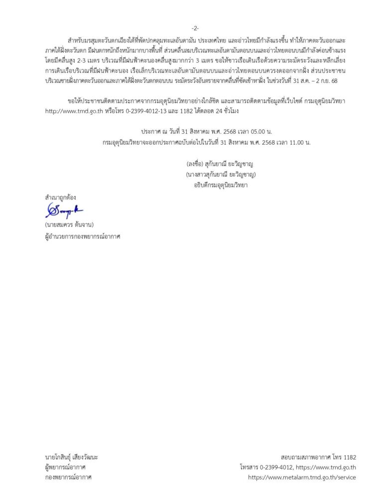 นอกจากฝนหนักแล้ว บริเวณ ทะเลอันดามันและอ่าวไทยตอนบน ยังมีคลื่นสูงเฉลี่ย 2-3 เมตร และในช่วงที่มีฝนฟ้าคะนองอาจสูงเกิน 3 เมตร เรือเล็กควรงดออกจากฝั่งทันที ขณะที่ประชาชนตามชายฝั่งภาคตะวันออกและใต้ตอนบน ต้องเฝ้าระวังคลื่นซัดเข้าฝั่งอย่างรุนแรง