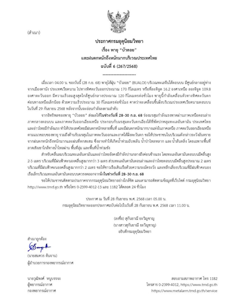 กรมอุตุนิยมวิทยาออกประกาศเตือนล่าสุดเกี่ยวกับ พายุไต้ฝุ่นบัวลอย (BUALOI) ที่กำลังเคลื่อนตัวเข้าฝั่งประเทศเวียดนามตอนบน ซึ่งจะส่งผลกระทบโดยตรงต่อประเทศไทย โดยเฉพาะในช่วงวันที่ 28–30 กันยายน 2568 ที่จะมี ฝนตกหนักถึงหนักมาก หลายพื้นที่ พร้อมเตือนประชาชนให้เฝ้าระวังภัยจากน้ำท่วมฉับพลัน น้ำป่าไหลหลาก และคลื่นลมแรงบริเวณชายฝั่งทะเล