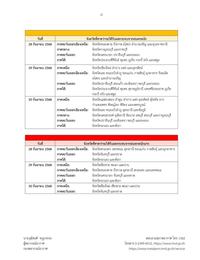 ร่องมรสุมกำลังแรงพาดผ่านภาคเหนือตอนล่าง ภาคกลางตอนบน และภาคตะวันออกเฉียงเหนือ ร่วมกับมรสุมตะวันตกเฉียงใต้ที่กำลังแรงปกคลุมประเทศไทย ส่งผลให้ในช่วง 28–30 กันยายน 2568 หลายพื้นที่ของไทยจะเผชิญกับฝนตกหนักถึงหนักมาก โดยเฉพาะ