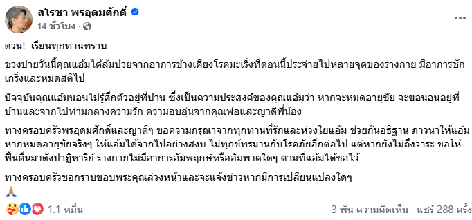 วันที่ 29 กันยายน 2568 วงการข่าวและสังคมไทยต่างสะเทือนใจ หลังแฟนเพจ “สโรชา พรอุดมศักดิ์” ของผู้ประกาศข่าวหญิงชื่อดัง “แอ้ม สโรชา” ได้ออกมาโพสต์แจ้งข่าวด่วนว่า เจ้าตัวมีอาการ ชักเกร็งและหมดสติ จากผลข้างเคียงของ โรคมะเร็งที่ลุกลามหลายจุดทั่วร่างกาย โดยขณะนี้เธอนอนไม่รู้สึกตัวอยู่ที่บ้านตามความประสงค์ส่วนตัว ที่อยากใช้เวลาสุดท้ายท่ามกลางครอบครัวและคนที่รัก