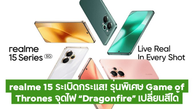 กระแสสมาร์ทโฟนซีรีส์ realme 15 กำลังเดือดจริงเดือดจัง เพราะนอกจากรุ่นหลักที่เปิดในหลายประเทศแล้ว realme ยังปล่อยหมัดเด็ด รุ่นพิเศษ Game of Thrones (GOT) Limited Edition บนฐาน realme 15 Pro โดดเด่นด้วยฝาหลังวัสดุ “Dragonfire” ที่ เปลี่ยนสีจากดำเป็นแดงเมื่อโดนความร้อน พร้อมลวดลายมังกรสีดำ-ทองและธีม UI จาก House Stark / House Targaryen แถมชุดสะสม Iron Throne, การ์ดตราสัญลักษณ์ และโมเดล Westeros ใส่มาเอาใจแฟนซีรีส์เต็มพิกัด