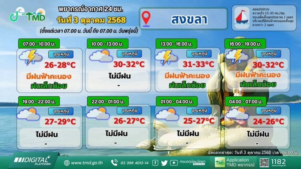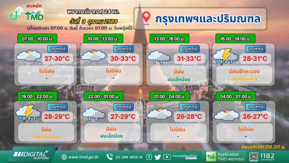 ประเทศไทยเข้าสู่ช่วงฝนลดแต่ยังไม่หมดสิ้น กรมอุตุนิยมวิทยา รายงานล่าสุดวันนี้ (3 ตุลาคม 2568) ว่า ฝนทั่วไทยมีแนวโน้มลดลง แต่ยังคงมี ฝนฟ้าคะนอง กระจายเป็นบางพื้นที่ โดยเฉพาะใน ภาคกลางและภาคใต้ตอนล่าง ที่ยังต้องจับตาเรื่องพายุฝนและคลื่นลมแรงอย่างใกล้ชิด พร้อมเตือน ชาวเรือและผู้เดินเรือในทะเลอันดามันและอ่าวไทย ให้ใช้ความระมัดระวัง เนื่องจากคลื่นอาจสูงถึง 1-2 เมตร ส่วนพายุโซนร้อน “แมตโม” ที่กำลังเคลื่อนผ่านฟิลิปปินส์ จะไม่ส่งผลโดยตรงกับประเทศไทย