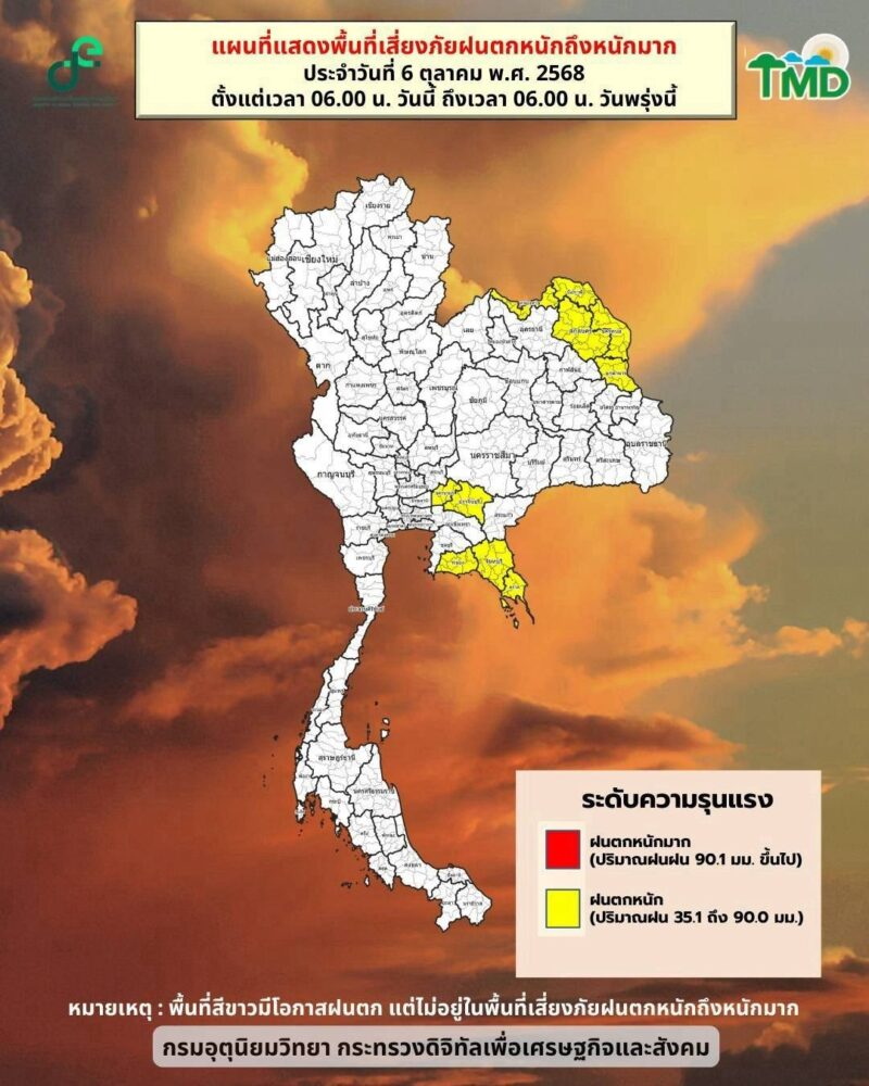 วันนี้ (6 ตุลาคม 2568) กรมอุตุนิยมวิทยา ออกประกาศเตือนประชาชนทั่วประเทศเตรียมพร้อมรับมือ ฝนตกหนักถึงหนักมาก โดยเฉพาะในพื้นที่ ภาคตะวันออกเฉียงเหนือ และ ภาคตะวันออก จากอิทธิพลของ พายุโซนร้อน “แมตโม” (MATMO) ที่อ่อนกำลังลงและเคลื่อนเข้าสู่มณฑลกว่างซี ประเทศจีน แม้พายุลูกนี้จะไม่เข้าสู่ประเทศไทยโดยตรง แต่ยังส่งผลให้ลมมรสุมตะวันตกเฉียงใต้ที่พัดปกคลุมประเทศมีกำลังแรงขึ้น ทำให้หลายจังหวัดเสี่ยงเกิดฝนตกหนักสะสม