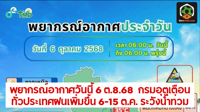 กรมอุตุนิยมวิทยาเตือนว่า ระหว่างวันที่ 6-15 ตุลาคม 2568 ประเทศไทยจะมี ฝนเพิ่มขึ้นทั่วประเทศ โดยเฉพาะช่วง 6-8 ต.ค. ที่จะมีฝนตกหนักมากใน