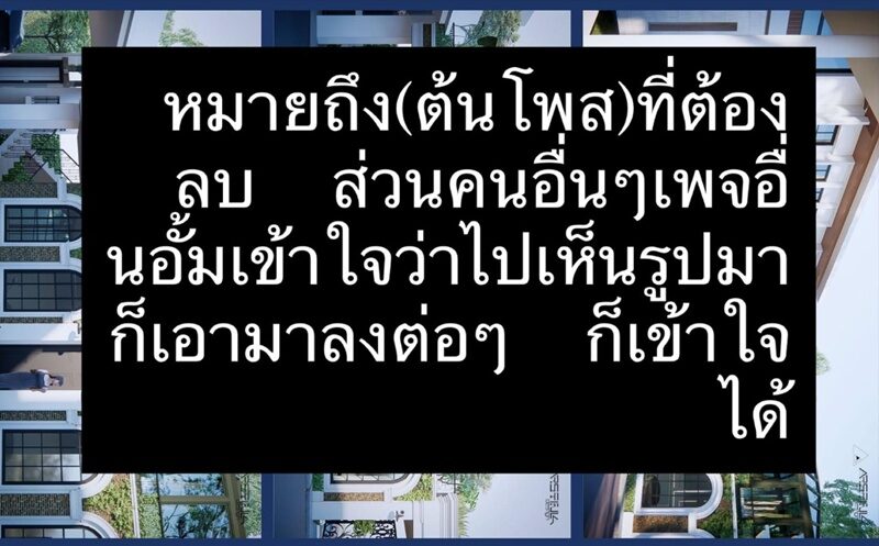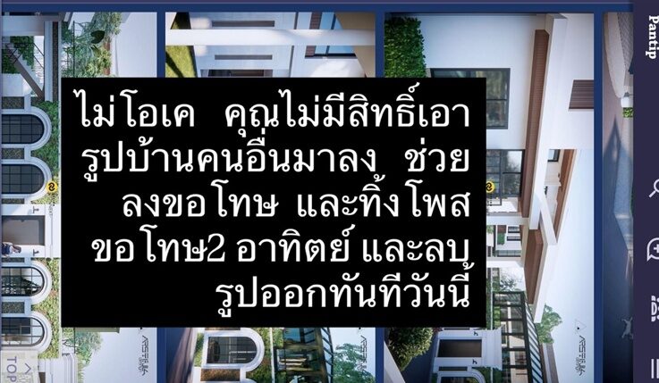 “ไม่โอเค คุณไม่มีสิทธิ์เอารูปบ้านคนอื่นมาลง ช่วยขอโทษและทิ้งโพสต์ขอโทษ 2 อาทิตย์ และลบรูปออกทันที”