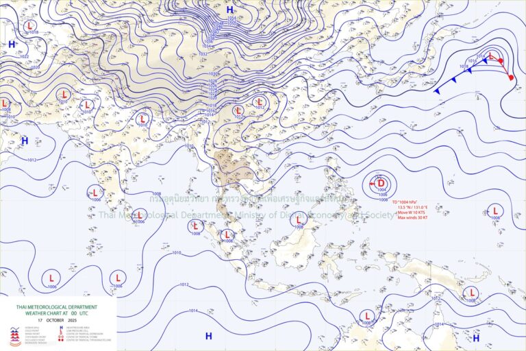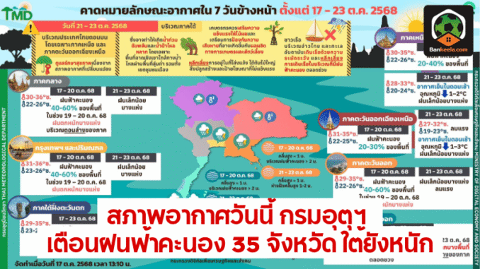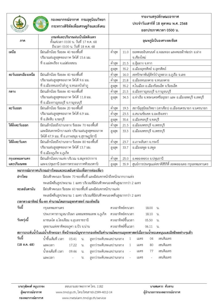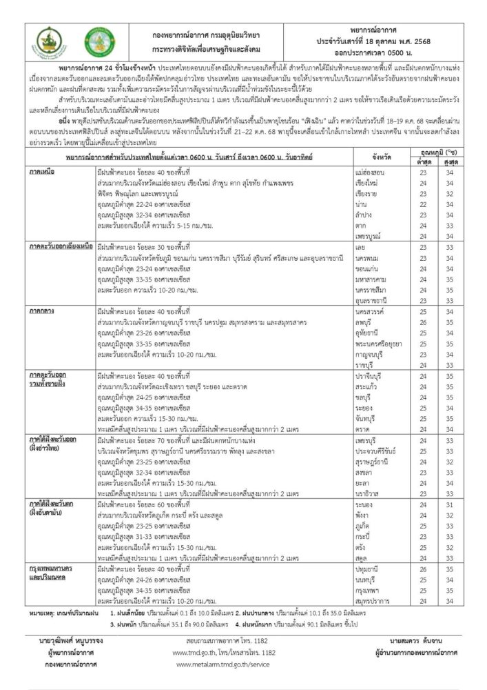 - 17–20 ต.ค. ฝนถี่บริเวณตอนล่างของภาคกลาง–ตะวันออก–ใต้ จากลมตะวันออก–ตะวันออกเฉียงใต้ ทะเลคลื่นสูงจุดพายุฝน >2 ม.