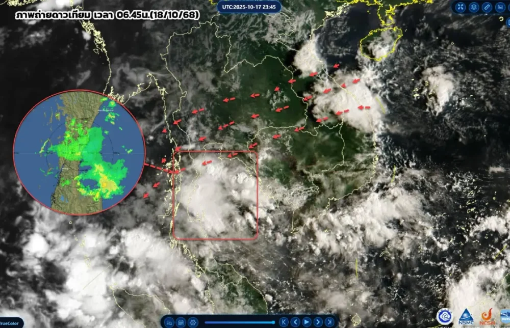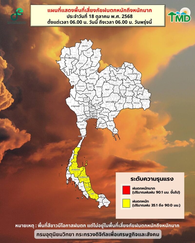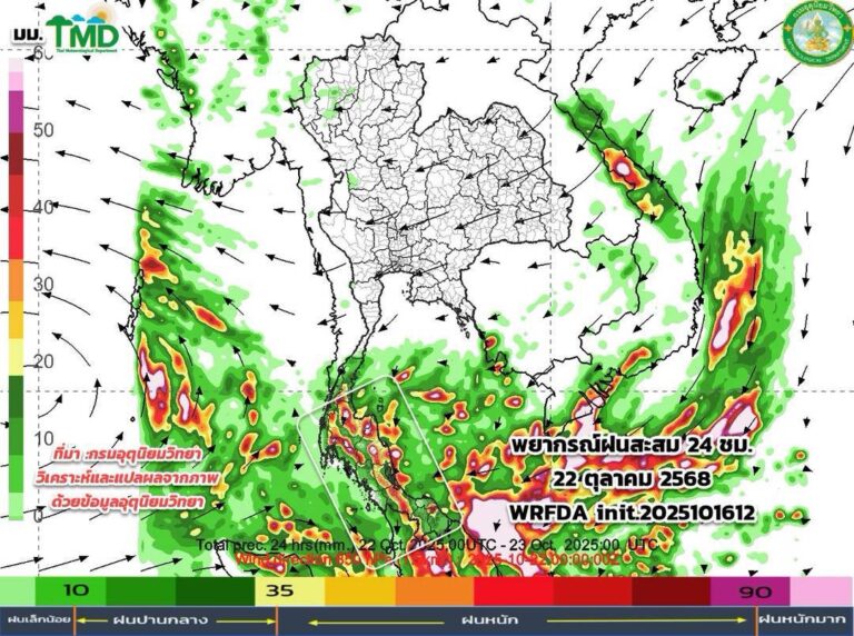พายุโซนร้อน “เฟิงเฉิน (Fengshen)” ยกระดับจากดีเปรสชันใกล้ฟิลิปปินส์ มีแนวโน้มเคลื่อนผ่าน ตอนบนฟิลิปปินส์ 18–19 ต.ค. ลงสู่ ทะเลจีนใต้ตอนบน ก่อน เข้าใกล้เกาะไหหลำ 21–22 ต.ค. แล้วอ่อนกำลังลง โดย ไม่เคลื่อนเข้าสู่ประเทศไทย ทว่า “แรงเหวี่ยง” ของระบบและลมตะวันออก–ตะวันออกเฉียงใต้ยังส่งผลให้ภาคใต้มีฝนหนักเป็นหย่อม ๆ และคลื่นลมแรงในอ่าวไทยตอนบนต่อเนื่องช่วงสุดสัปดาห์นี้