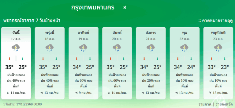 - กรุงเทพฯ–ปริมณฑล ฝน 40% ของพื้นที่ ต่ำสุด 24–26°C สูงสุด 34–35°C ลมตะวันออกเฉียงใต้ 10–20 กม./ชม. เช็กแนวโน้มรายวันในวิดเจ็ตด้านบนได้เลย.
