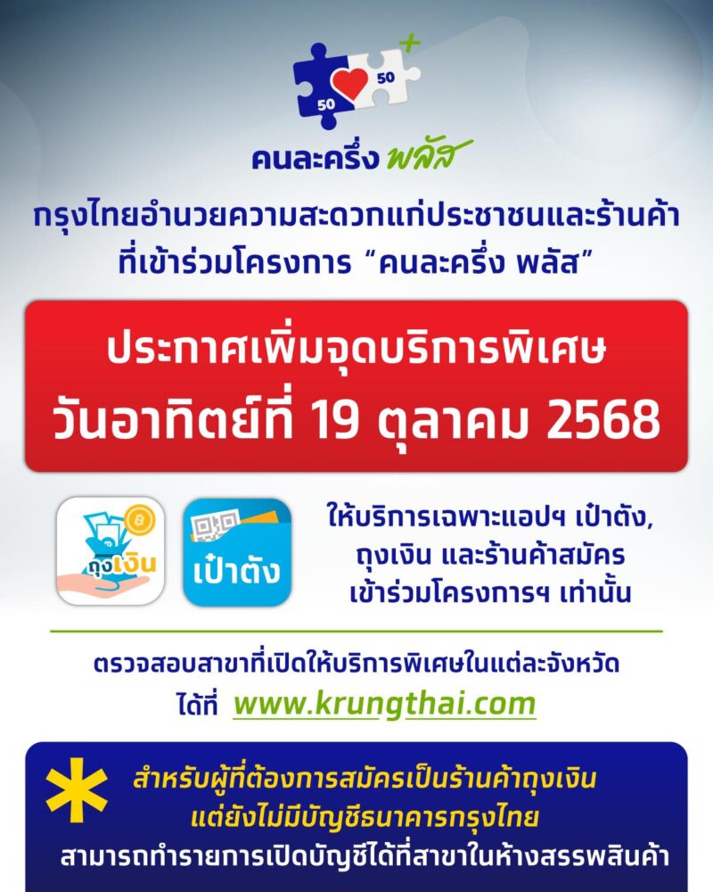 เพื่อรองรับประชาชน/ร้านค้าช่วงเร่งด่วน ธนาคารกรุงไทยประกาศ จุดบริการพิเศษ 67 สาขา วันที่ อาทิตย์ 19 ต.ค. 2568 เวลา 08:30–16:00 น. เน้นช่วยเรื่อง แอปเป๋าตัง, ถุงเงิน และสมัครร้านค้า (บางสาขาเวลาบริการต่างกันเล็กน้อย) เหมาะมากสำหรับผู้สูงอายุ/ผู้ต้องการความช่วยเหลือเรื่องมือถือ