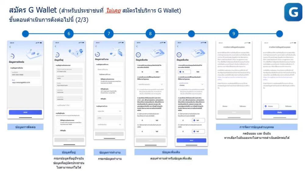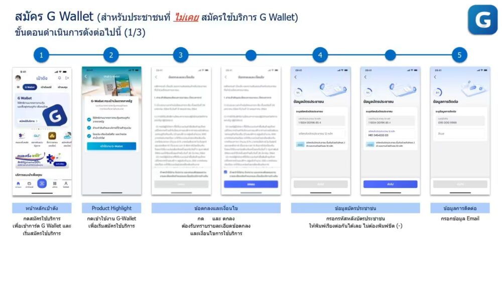 - รับผลลงทะเบียนผ่าน แจ้งเตือนในแอป เติมเงินเข้า G Wallet แล้วเริ่มใช้สิทธิได้ตามกำหนด