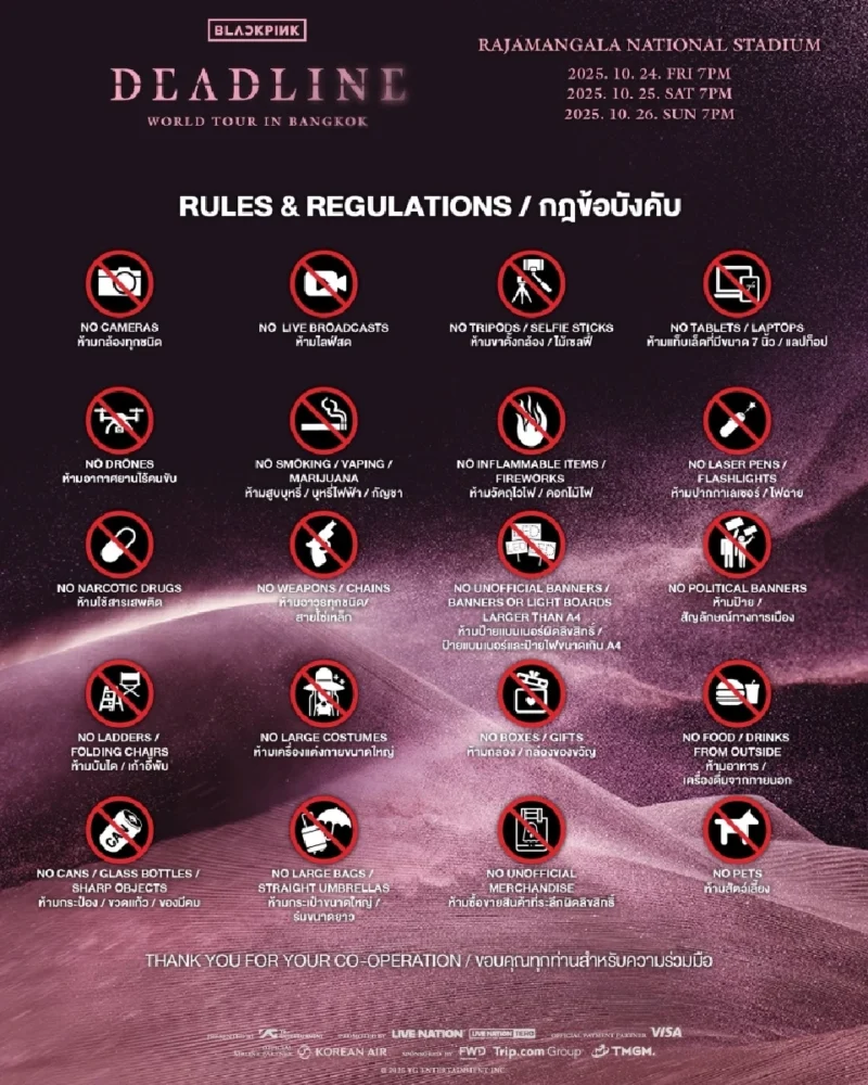 งดพก: แท่งยาว/ไม้เซลฟี/ร่มปลายแหลม, กระป๋องสเปรย์, ของมีคม, ไอเท็มชิ้นใหญ่, กล้อง/เลนส์ตามที่ผู้จัดห้าม (เช็กป้ายประกาศหน้างาน)