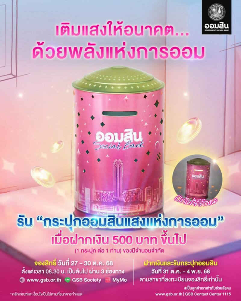 นอกจากเปิดจองกระปุกแล้ว ธนาคารออมสินยังจัดงานใหญ่ “GSB SAVINGS FORUM 2025” ภายใต้แนวคิด “AI & AOM ออมยุคใหม่ สร้างสังคมไทยให้ยั่งยืน” ในวันที่ 31 ตุลาคม 2568 ณ ห้องแกรนด์บอลรูม ชั้น 6 อาคารออมสินพิพัฒน์ สำนักงานใหญ่